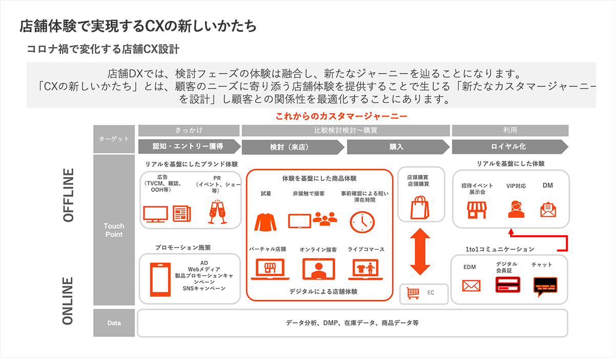 また、チャネルをクロスしたサービスの融合により、店舗における顧客体験(CX)の設計も大きく変わってくる。これまでのオムニチャネルにおいては、チャネル間の隔たりをなくして共通のサービスを提供しながらも、認知・検討・購入・ロイヤル化といったカスタマージャーニーを、オンラインユーザーとオフラインユーザーで分けて設計することが可能だった。