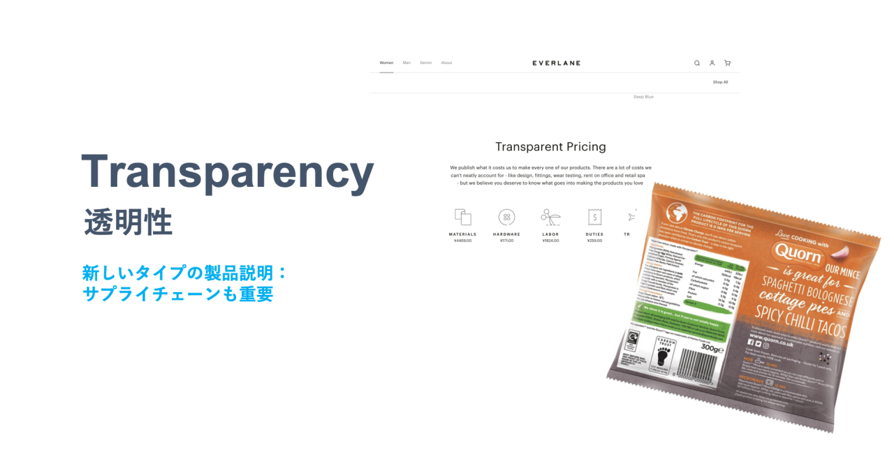 透明性という点では注目すべきは、商品説明ページに表示されている商品情報です。これまでは価格や仕様、注意書きなどが主なものでしたが、最近ではサプライチェーンの各ポイントを分解してそのプロセスが最終的な顧客価格に与える影響を複数の価格情報でお客様に見せるようになっているケースが散見されます。