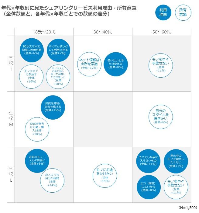 現状、総合的に見るとシェア先端層は18~20代高年収層に特出して出現しており、一定の年代間での「シェア」に対する価値観の分断が生まれているようにも見てとれます。しかし、価値観やマインドは、環境によっても大きく変わっていくものであるので、他の世代にもシェア利用が広がっていく可能性は大きく、現に全ての年代で「シェア先端層」は昨年と比べて増加傾向にありました。