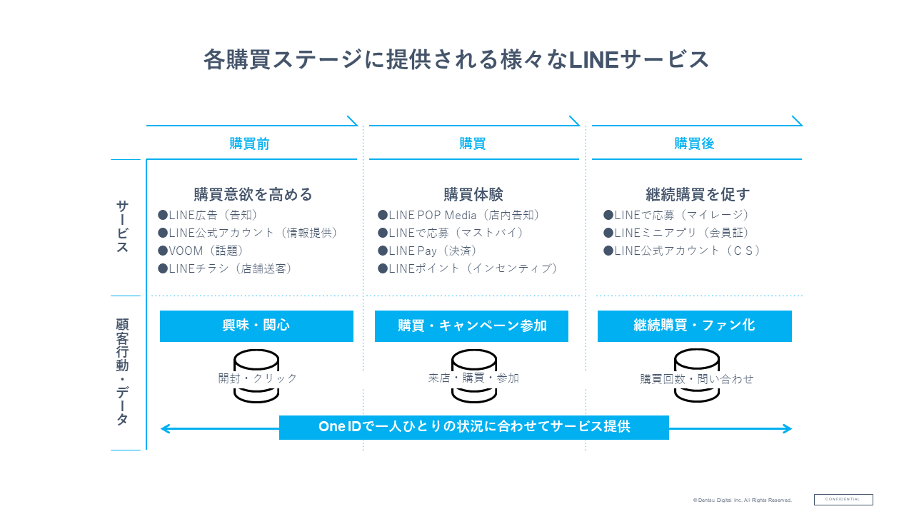 このように、ユーザーとプラットフォーム間の関係が築きやすい中で、各顧客行動ステージにおけるLINEサービスが複合的に展開されています。購買を中心とした消費行動全体が「見える化」され、企業はそれに対して適切なソリューションを提供できる、一大生活圏が完成しつつあるな、と感じています。