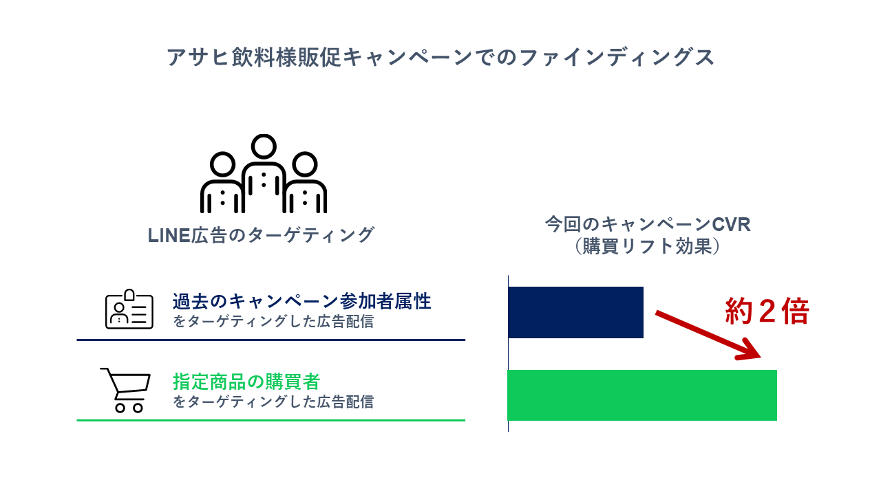 今回は、過去のキャンペーン参加者の属性に根差した広告配信と、購買データを元にした広告配信の2パターンを実施しました。結果として、購買データを使った広告配信の方が、おおよそ2倍程度、キャンペーンへの参加につながった、というデータが得られました。