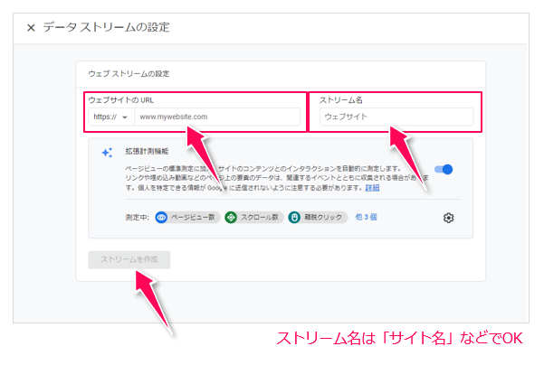 - 「ストリーム名」はサイト名など、任意でわかりやすい名前にする
