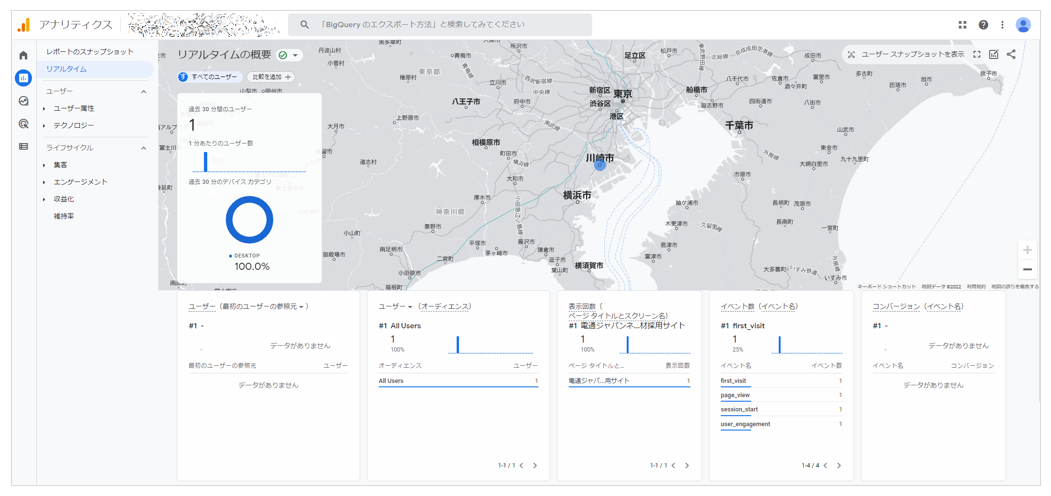 これで画面右上の[公開]をクリックして、GTMの設定は完了です。以下はGA4の[レポート]>[リアルタイム]を表示した画面です。