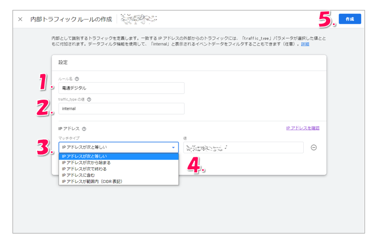 - マッチタイプ:任意で選択(「次に等しい」や「含む」など。正規表現は利用不可)