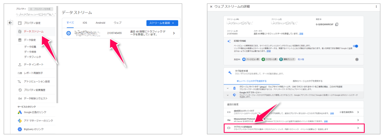 まずは、[管理]>[プロパティ設定]>[データストリーム]を開き、対象のデータストリームをクリックします(下図左)。[ウェブストリームの詳細]という画面が表示されるので、最下部までスクロールして、[タグ付けの詳細設定]をクリックします(下図右)。