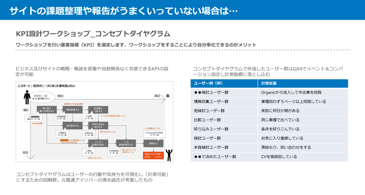 コンセプトダイヤグラムとは、顧客の心理変容と企業の施策を図解し、顧客の理解と施策の評価を行うメソッドです。カスタマージャーニーマップと比べてGA4の計測指標に落とし込みやすいという性質があるため、Webサイトの課題を見つけるには大変重宝する方法です。