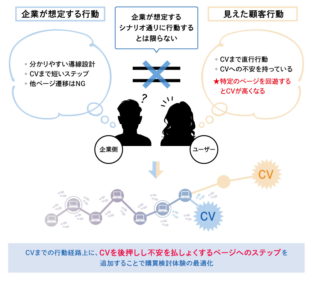 今回興味深かったのは、コンバージョンするユーザーの想定行動とAIで発見したゴールデンパスに乖離(かいり)があったんですね。想定では短く分かりやすい導線でCVにつなげてあげるほうがよいとジャーニーマップを考えていたんですが、AI分析では「本当に欲しい情報」を自ら求めていることが分かり、コンバージョン率が上がっている。つまり、一直線にコンバージョンに向かわず、その手前で違うページの情報を求めているという行動に、「コンバージョンの予兆」がありました。