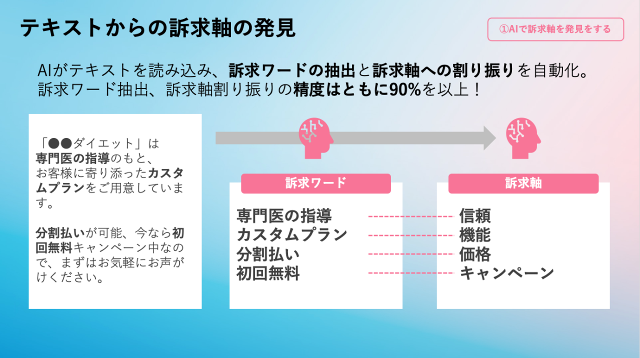 山本 : 「∞ AI(ムゲンエーアイ)」は、お客さまのビジネスを無限にグロースさせるためのAIソリューションです。AIがテキストを読み込み、訴求ワードの抽出と訴求軸への割り振りを自動で行ってくれます。クリエイターの発想や能力を拡張する「人に寄り添うAI」をコンセプトに開発しました。