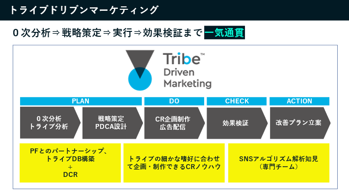 Tribe Driven Marketing とは、こうしたデータを基に共通の趣味嗜好・価値観で繋がり、情報交換しているユーザー群集団を“トライブ”として捉えて分析、アプローチする手法です。