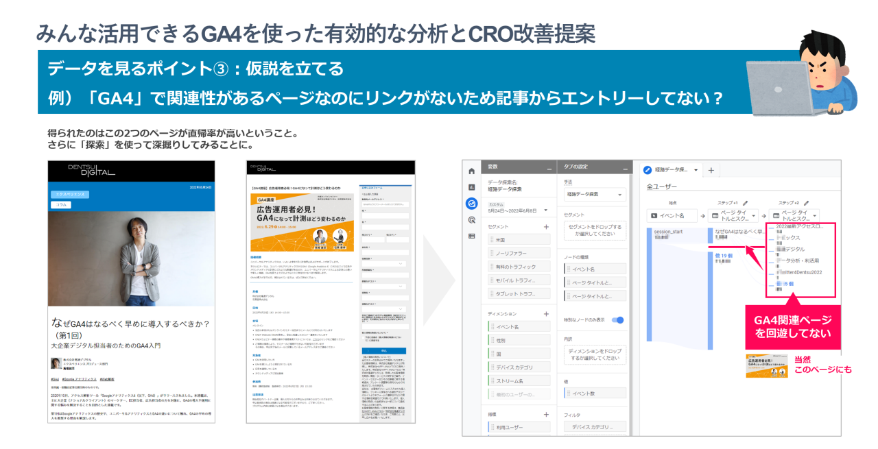 さらに、セミナーLPからGA4関連記事ページへの遷移も増え、この2つのページを回遊してコンバージョン(セミナー申し込み)するユーザーが増えました。簡単な分析から改善施策を考え、実行したことで、たった数日でコンバージョン増加という成果が出たというわけです。