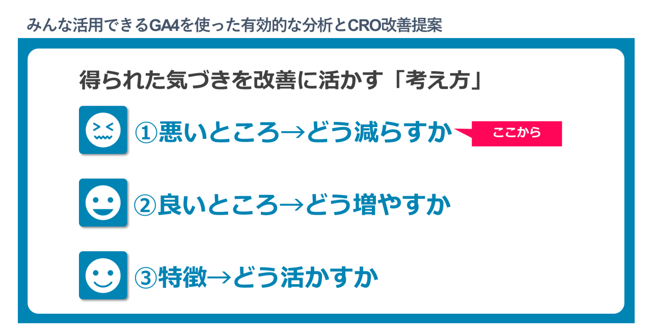 GA4を見るときは、ただレポートを見るだけでなく、常にどこか改善できるところはないかと探す姿勢が大事です。「対象を決める」→「悪いところを探す」→「仮説を立てる」という流れを意識し、こまめに改善施策を実施してみてください。