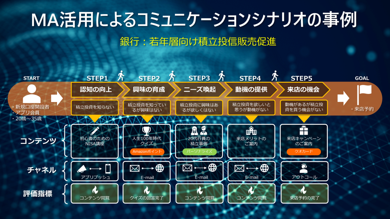 ステップ3の「ニーズ喚起」とステップ4の「動機の提供」ではコンテンツ閲覧を、そして、ステップ5の「来店の機会」ではアウトバウンドコールによる来店予約完了を指標に設定しています。