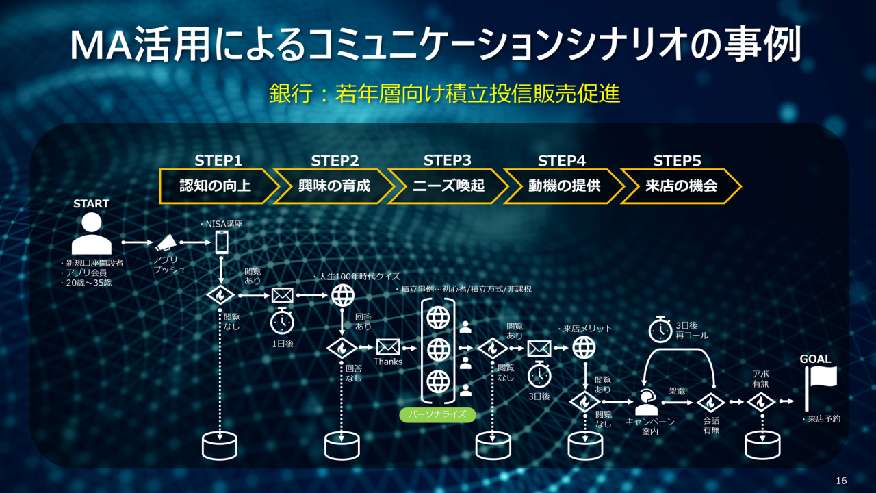 MAを活用したアプローチを紹介します。若年層向けの積立投信商品の販売を促進するシナリオコミュニケーションの事例です。ターゲットは以下のように設定します。
