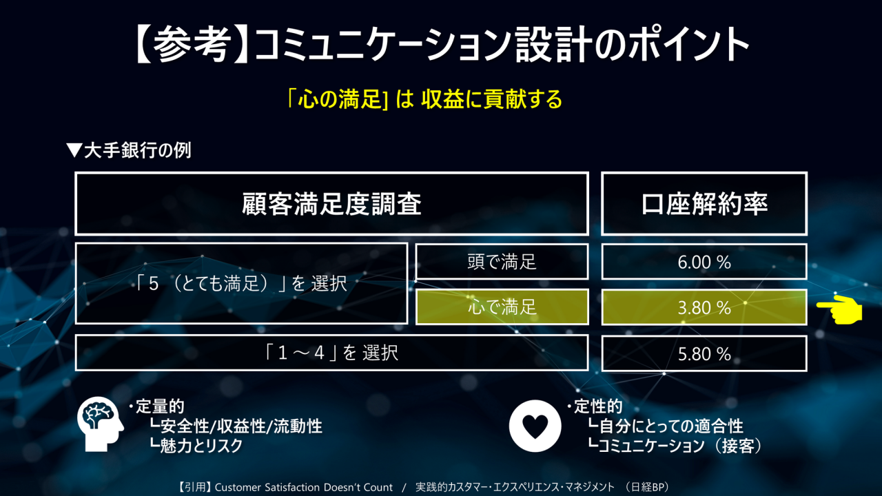 この両者を比べると、心で満足した顧客のほうが、その後の口座解約率が低い傾向があるとのことでした。
