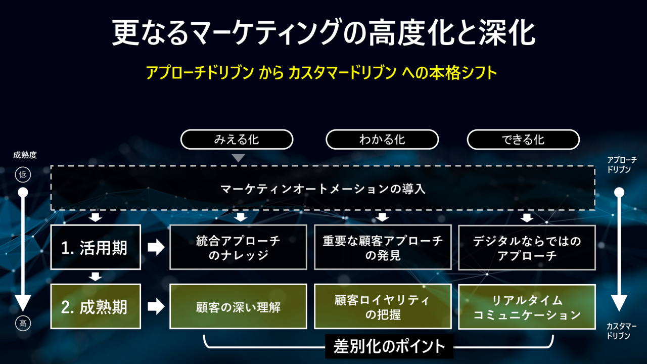 次の段階は「成熟期」です。データから得られるお客様のより深い理解や、お客様のロイヤルティの向上把握の進展、チャネルを連携させたリアルタイムのコミュニケーションが実現される段階です。