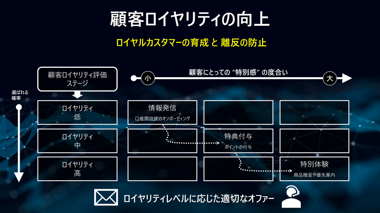 そして、顧客ロイヤルティの向上については、「ロイヤルカスタマーの育成と離反の防止」がポイントになります。