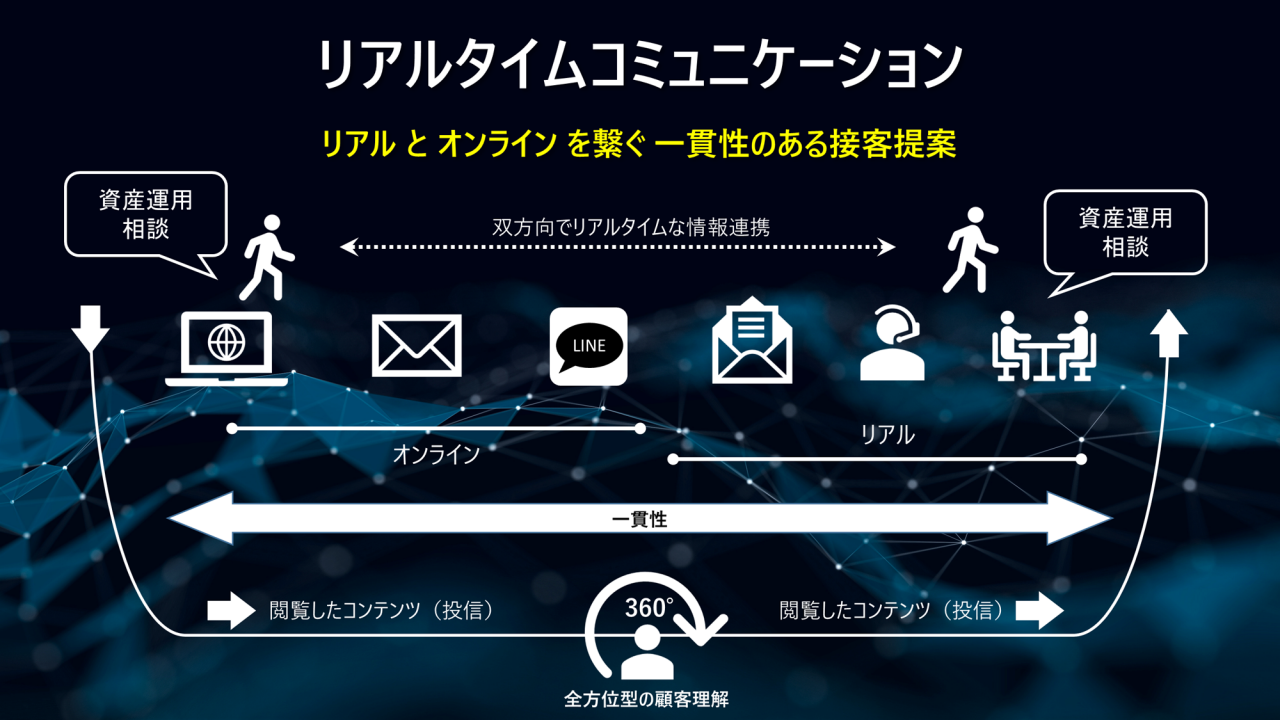 資産運用の相談を目的にWebサイトを閲覧したお客様に対して、閲覧コンテンツなどのデータが取得されれば、そのデータを店舗のコンサルタントにリアルタイムに共有して、興味、関心に応じたコンサルティングを行うことが可能になります。
