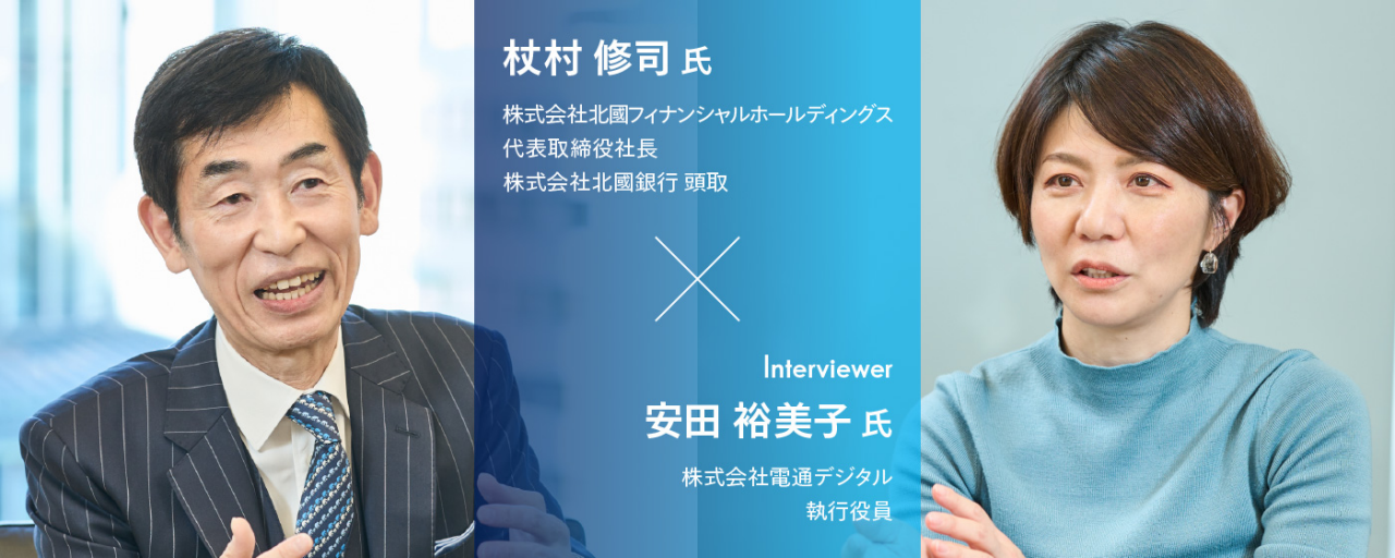 DXの本質は、継続的な事業成長に向け、自らが変わり続けていくこと――。DXによる組織変革を実現する国内企業に電通デジタルがインタビューをし、成功のカギを探る「変革文化を生み出す日本流DX」。第2回は、日本初の銀行勘定系システムのクラウド移行を実現するなど先進的な取り組みで注目を集める北國フィナンシャルホールディングスの杖村修司代表取締役に、電通デジタル執行役員の安田裕美子氏が迫った。