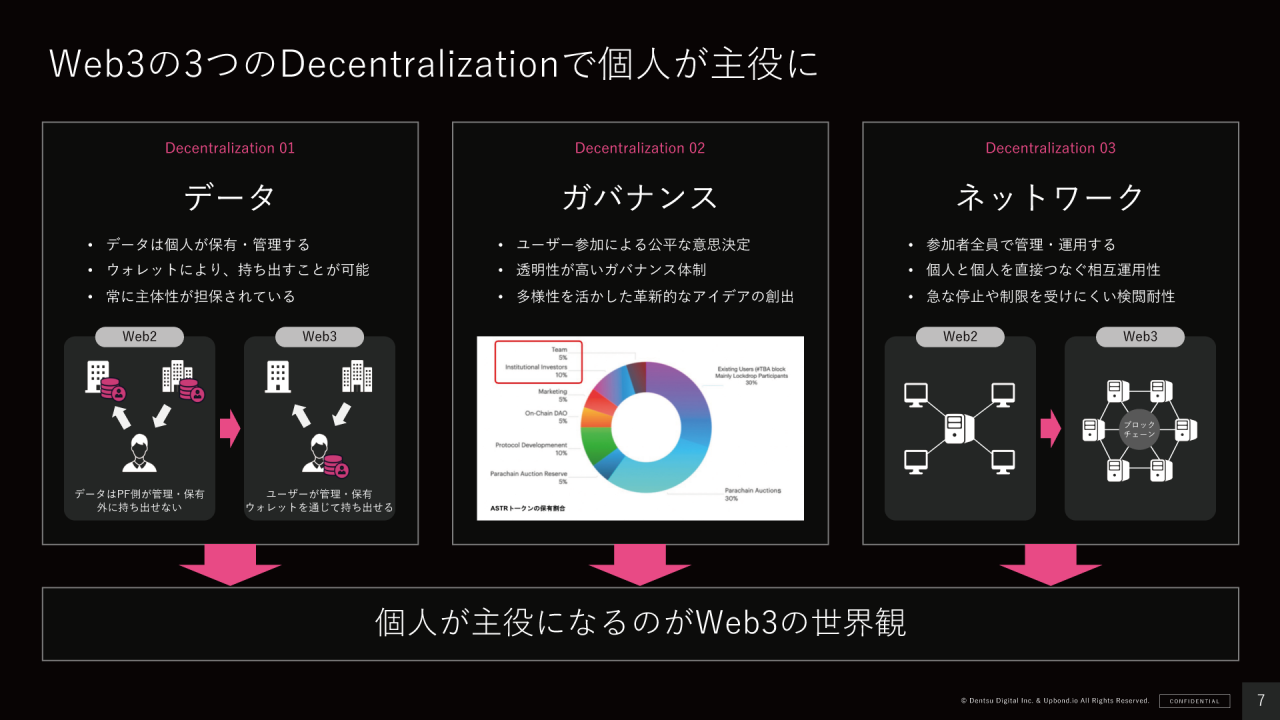 現在のWeb2の環境では、主にプラットフォーム側で管理されている「データ」「ガバナンス」「ネットワーク」。Web3では、ブロックチェーン技術を使ってこれらをDecentralizeし、ユーザーの主体性を担保します。