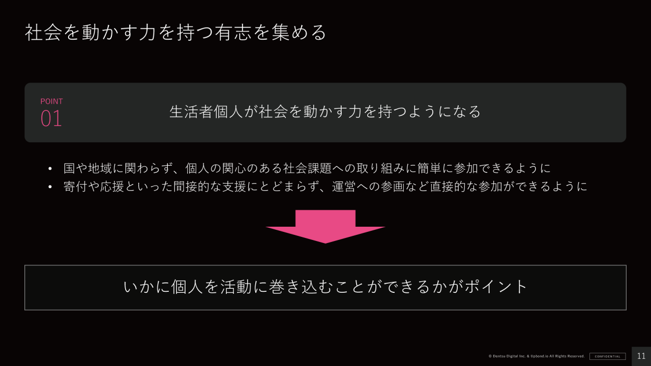 UPBONDのWeb3領域における豊富な知見・経験と、電通デジタルの実行力で、多くの企業の事業変革、価値創造のお手伝いをさせていただきたいと思っています。