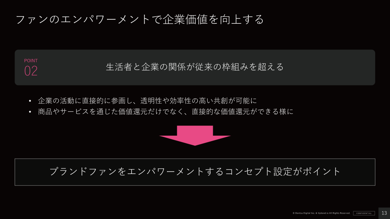 それによりユーザーのエンゲージメントが高まり、ブランドとしての価値が高まる、という循環が作り出せる。Web3テクノロジーは、ファンをエンパワーメントして企業価値に転換することができるのです。