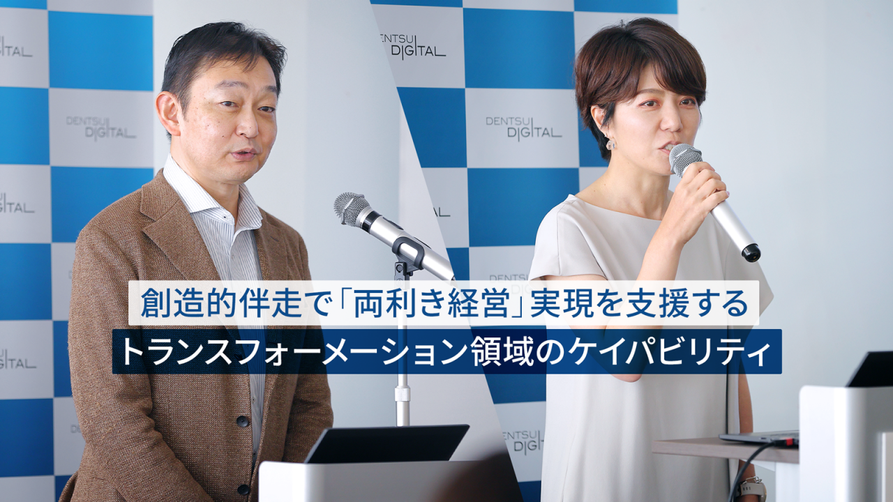 2023年7月26日に、電通デジタルはメディア向け「トランスフォーメーション領域事業説明会」を開催しました。「トランスフォーメーション領域」において行ってきたDX支援の事例を交えながら、同領域の現在の取り組みや強み、今後の事業戦略、注力領域について、代表取締役社長執行役員の瀧本恒と、執行役員の安田裕美子が説明しました。