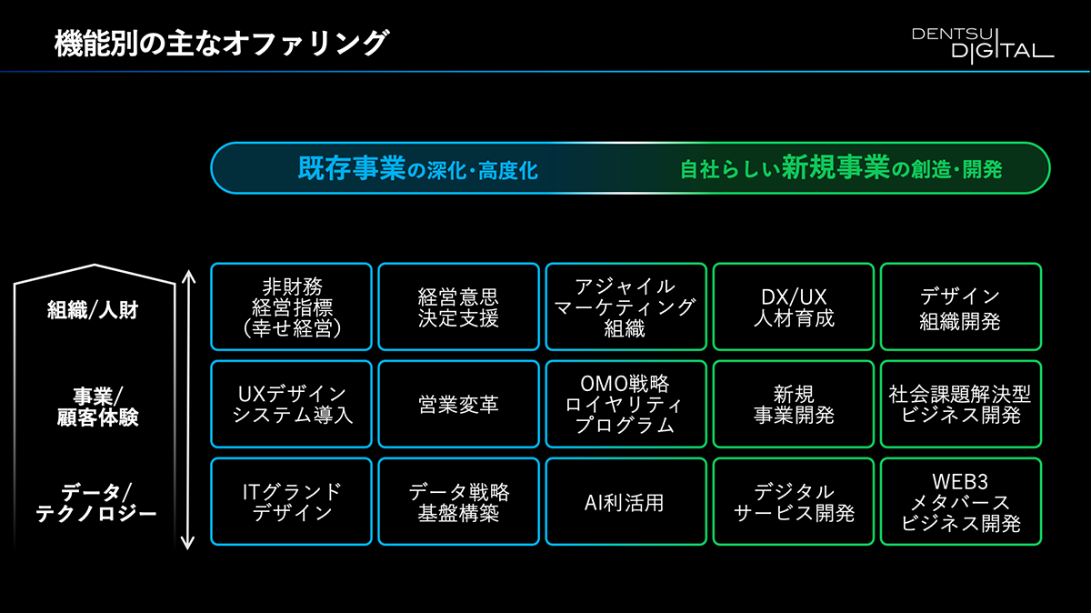 機能別の具体的なオファリングは以下のとおりです。組織/人財に関わる支援、事業/顧客体験をつくる支援、データ/テクノロジーに関する支援に関して、戦略・構想から企画・開発、実行まで伴走させていただいています。