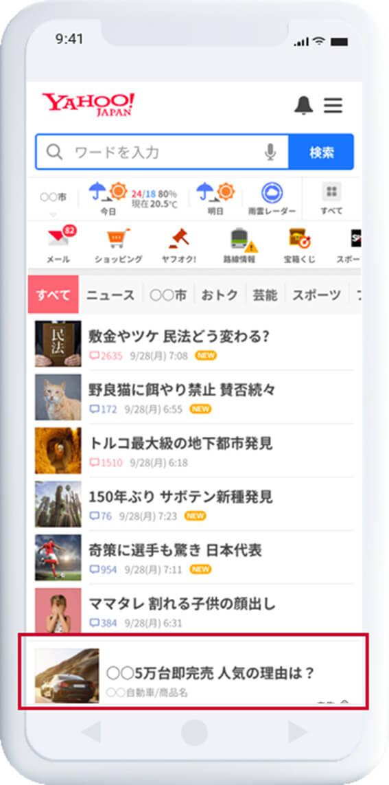 「Yahoo!ニュース トピックス」内のプロモーション枠(赤枠は本説明用に挿入)