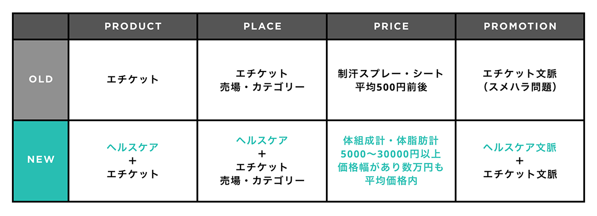 ニオイをエチケット文脈だけでなく、ヘルスケア文脈として体験の解像度を上げる。そのCX視点に気づいた時、マーケティング4P視点と照らし合わせると事業を更にドライブさせるビジネスデザインが見えてきました。
