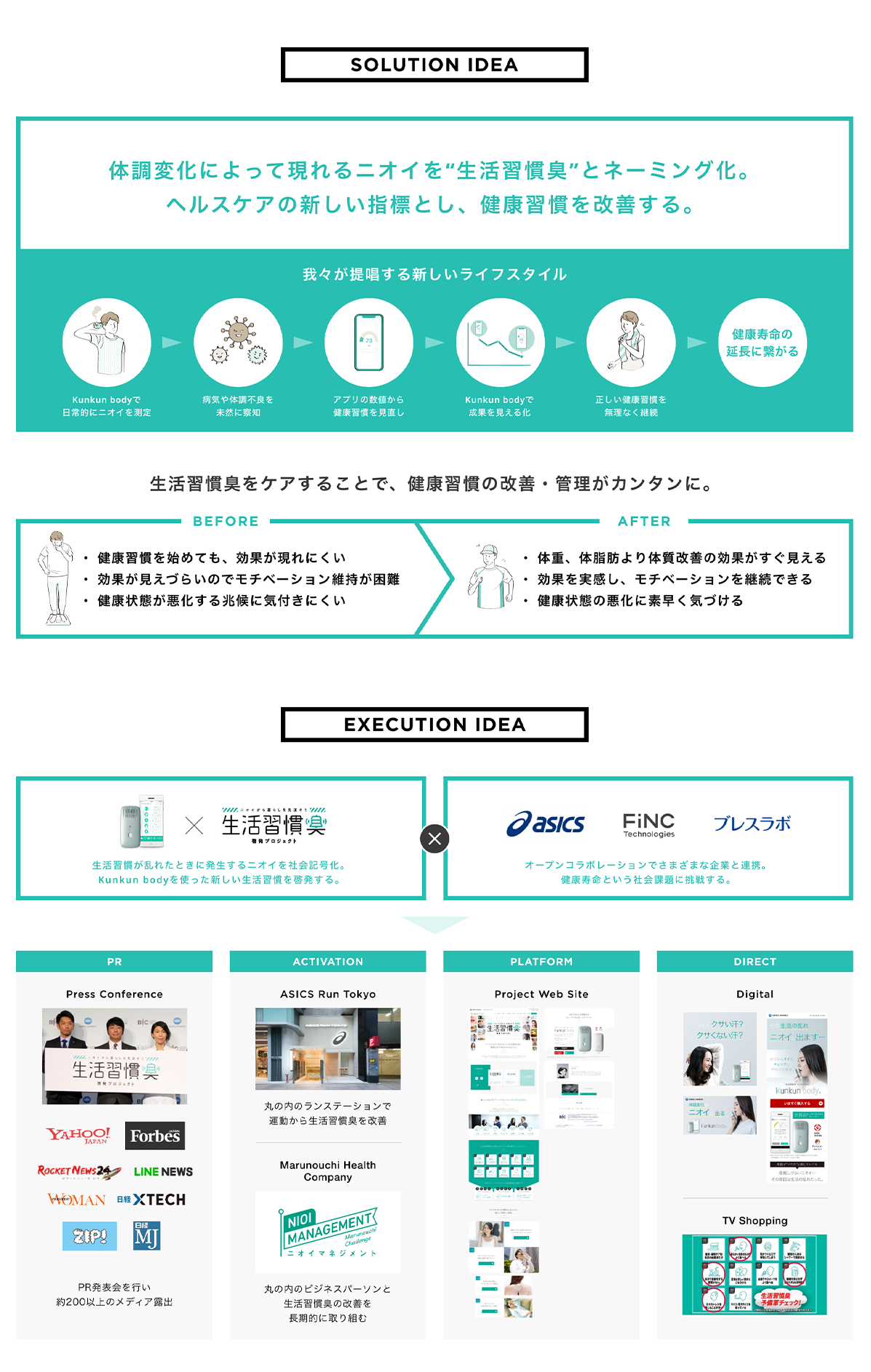 Kunkun bodyをエチケット製品だけでなく、ヘルスケア製品としてもポジショニングを取る。そのことで、売場の拡張、価格問題が解消される。製品・価格はそのままに戦い方をクリエイティブすることで、事業課題であった選好性の拡張が推進されるビジネスデザインとなりました。