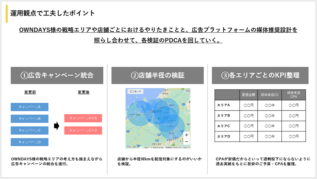 大野:P-MAXの運用に関しても、広告キャンペーンの統合や店舗半径の検証、エリアごとに最適なKPIの整理など、OWNDAYS様の戦略エリアや現状に合わせた運用を心掛けました。