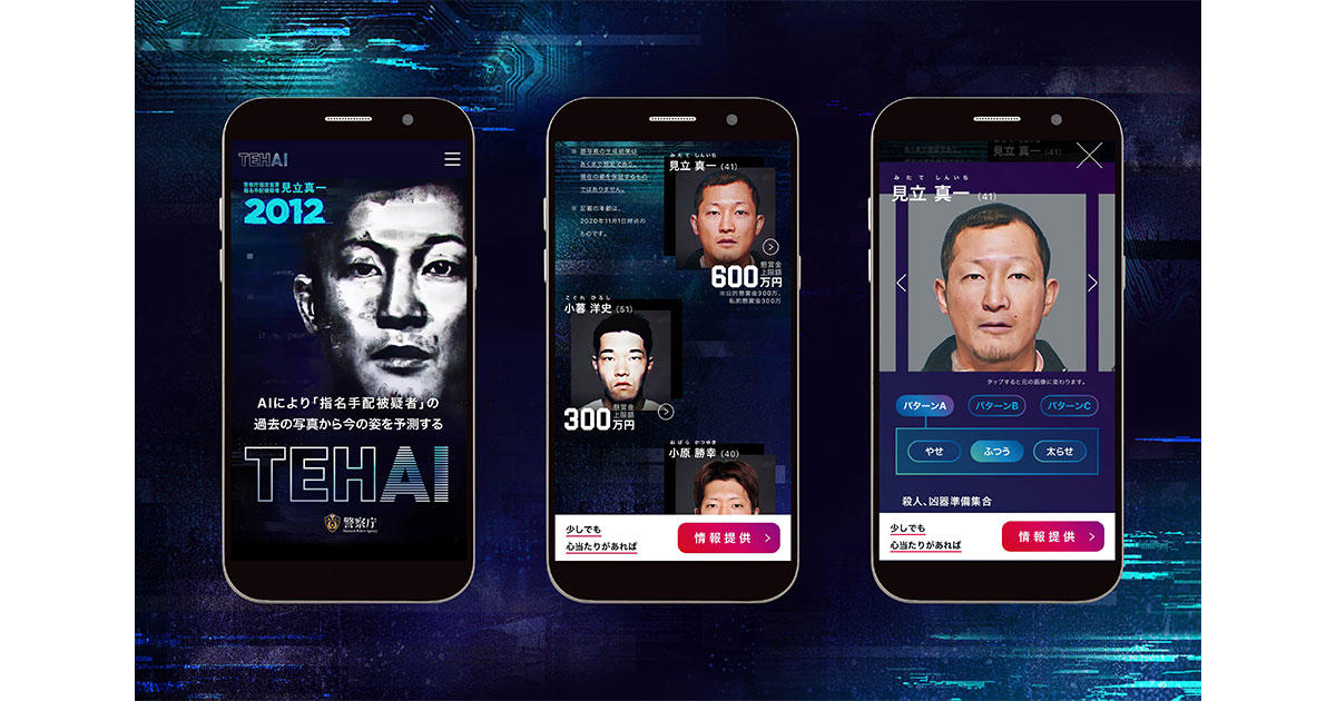 2020年11月の指名⼿配被疑者捜査強化⽉間に先⽴ち、2020年9⽉30⽇から12月31日まで実施しました。約630名(2020年8⽉末日時点)の指名⼿配被疑者の中で、警察庁指定重要指名⼿配被疑者12 名のうち5 名の現在の姿をAI によって予測し、指名⼿配被疑者の存在を生活者に認知させ、情報提供に繋げることで指名⼿配被疑者の検挙の可能性向上を目指しました。
