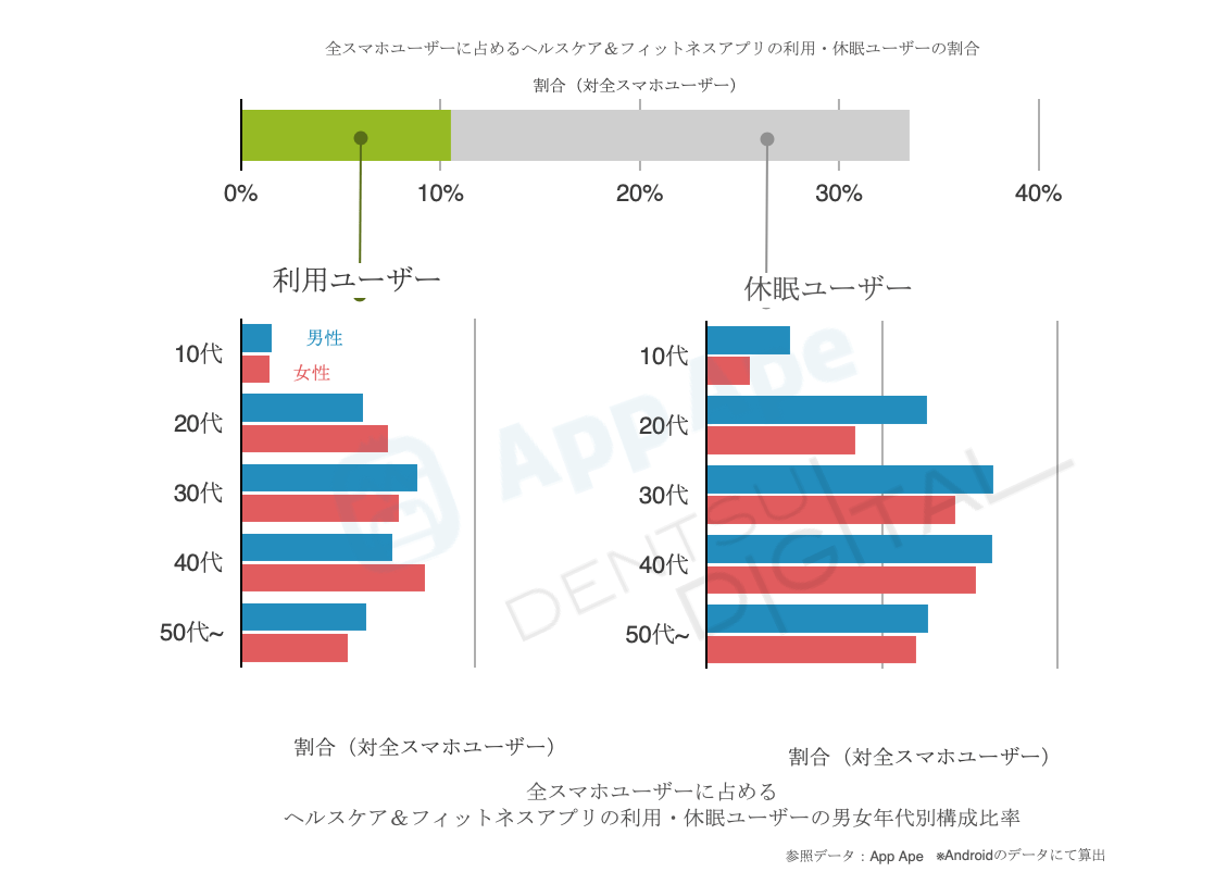 国内のモバイル・アプリ利用者のうちヘルスケア&フィットネスアプリ利用率は5%から10%へ2倍上昇。今後も成長産業