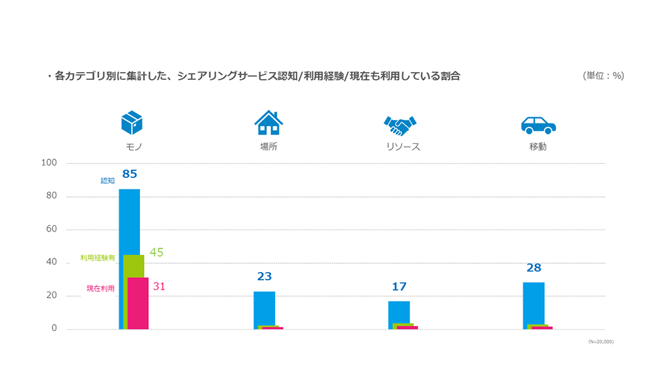 シェアリングサービスの認知は全体で86%に上り、シェアリングエコノミーの社会への拡がり・浸透を示しています。また、サービスカテゴリ別にみると、認知/利用経験/現在利用のすべてにおいて、「モノのシェアリングサービス」が突出しており、次いでバイクシェアやカーシェア等の「移動のシェア」の認知が28%と高い結果となりました。
