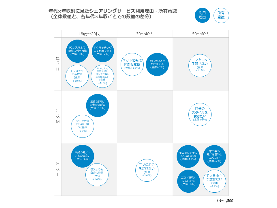 年代別、年収別にシェアリングサービス利用理由・特徴的な生活価値観の結果を見ると18歳~20代高年収層には「使わなくなったものはすぐに手放す」といったミニマリスト的趣向を持つ人が多いことが分かりました。また、モノを所有することよりも、人とシェアすることに価値を感じ、多様な人との繋がりを望む層であることから、今後のシェアリングサービスの浸透・拡大をけん引するセグメントとなることが伺える結果となりました。