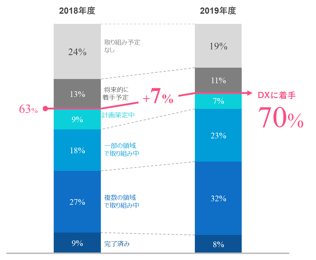 ①DXに着手している企業は70%(2018年度から7%増加)
