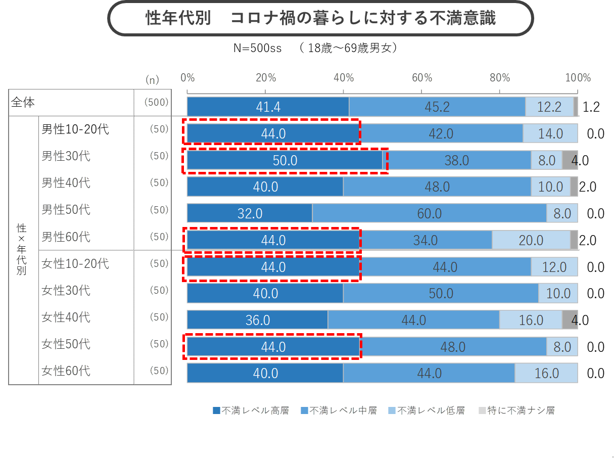 ②不満レベル高層の割合が高かったのは、30代男性の50%を筆頭に、10-20代男女・50代女性・60代男性が44%という結果でした。