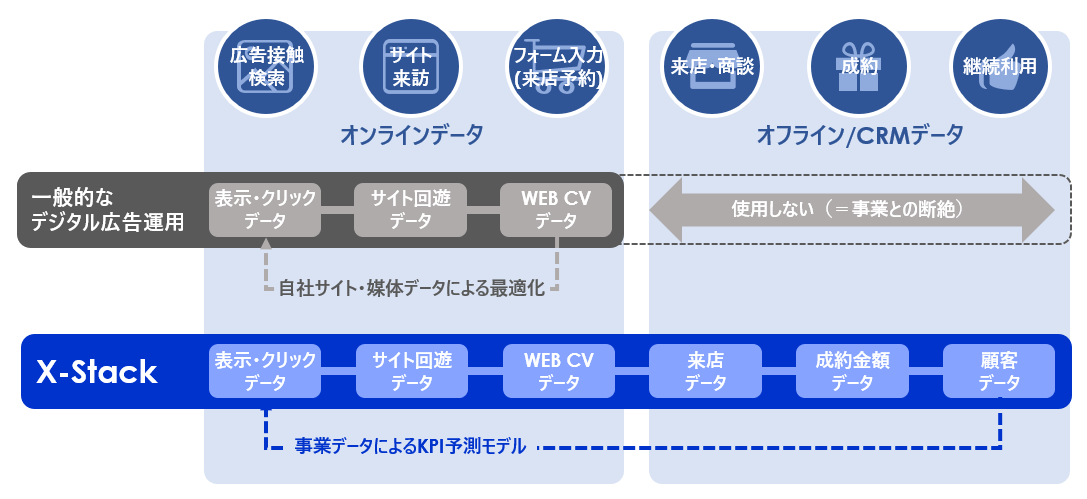 近年、デジタル広告は、技術の進化に伴いWebサイト上の行動に基づく高精度なユーザーターゲティングが可能になりました。しかし、Webサイト上でのコンバージョン後の店舗来店、成約、LTV(顧客生涯価値)までの企業が保有するオフラインでのCRM(顧客関係管理)データを取り入れたターゲティングは難しく、オンラインとオフラインの分断によって適切なデータ活用ができないという課題に直面していました。