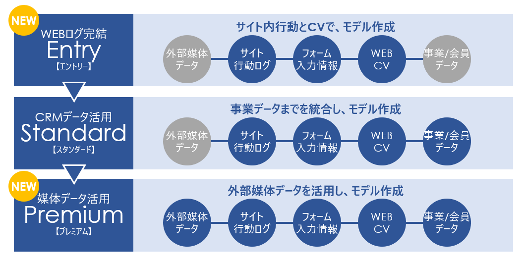 1つ目は、CRMデータを保有しない企業でも導入できる「X-Stack Entry」です。Webサイトのみで購入・契約が完了する場合や、店舗での購買ログ情報を持ち合わせていない場合でも、オンラインデータのみで事業KPIに近いマイクロコンバージョンの予測モデルを構築し、施策を最適化します。