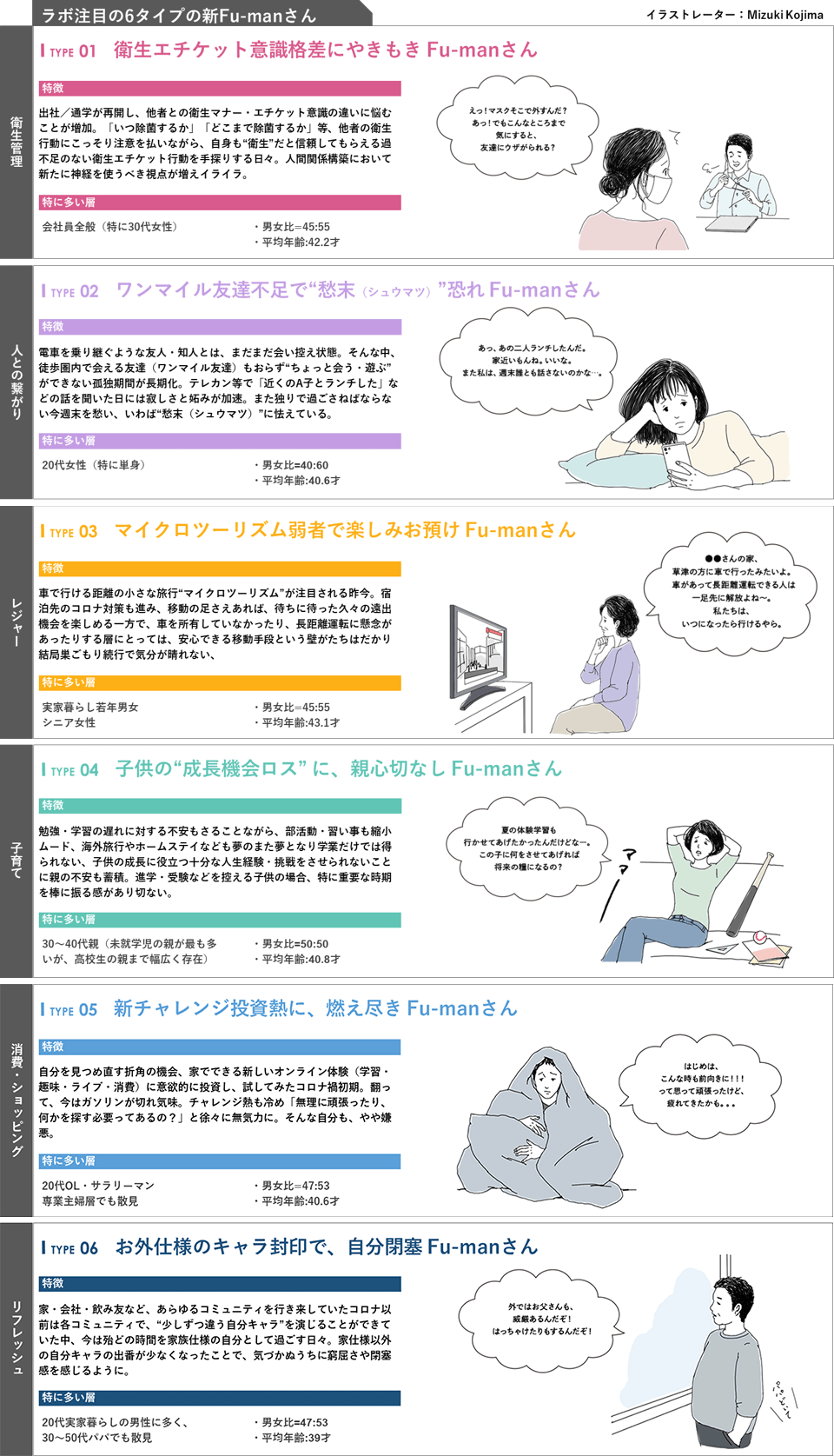 ①不満の質にも少しずつ変化が見られた中、先述したWithコロナ社会で定着傾向にある5大不満テーマ(レジャー、リフレッシュ、人との繋がり、衛生管理、ショッピング)を中心に、ラボとして注目したい6タイプの"新Fu-man"さんを抽出しました。