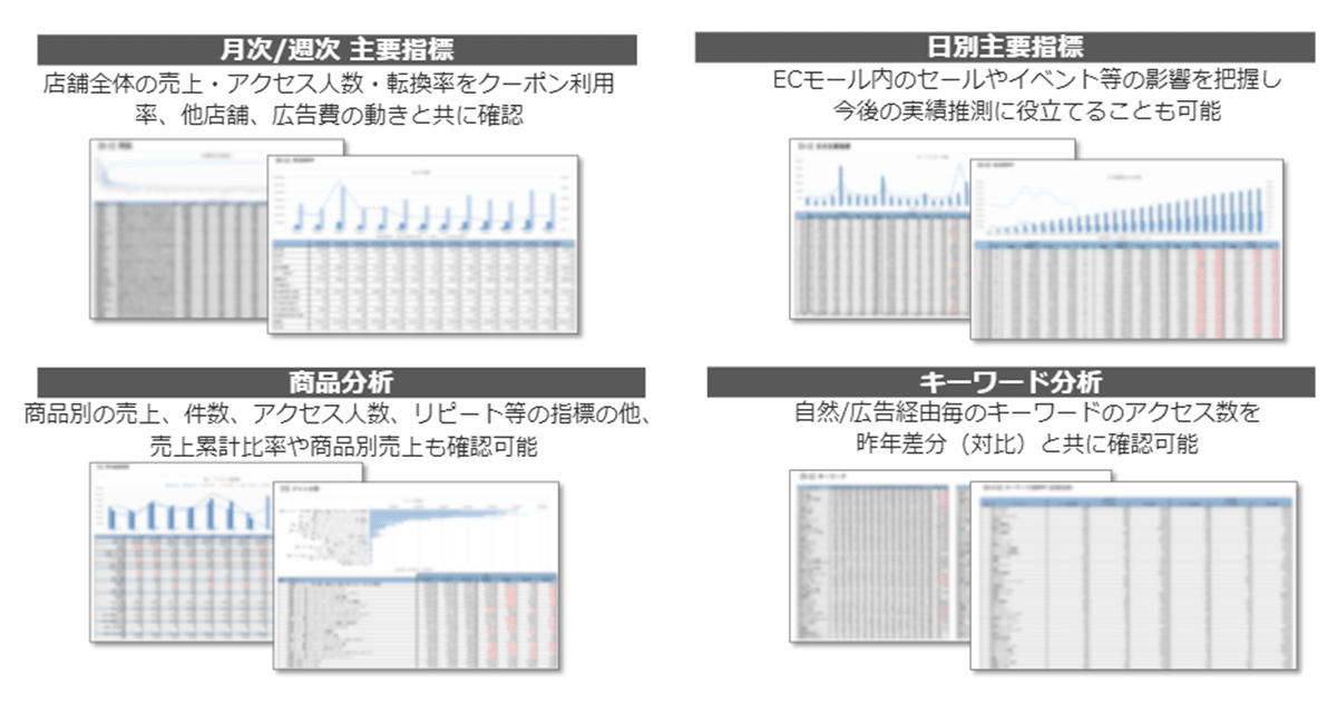 なお第一弾は、楽天市場、Yahoo!ショッピングで対応します。今後は他のECモールや、ShopifyなどのSaaS(Software as a Service)を活用した自社ECサイト分析やAPI開発にも対応し、ECプラットフォーム全体を通して企業の特長に沿ったEC販売戦略や分析など、最適な施策を行います。