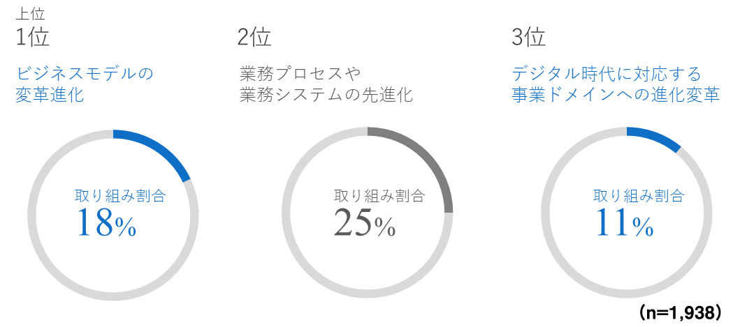 ②昨年比で「業務プロセスや業務システムの先進化」は引き続き推進しているが、微増しているのは「ビジネスモデルの変革進化」「デジタル時代に対応する事業ドメインへの進化変革」。