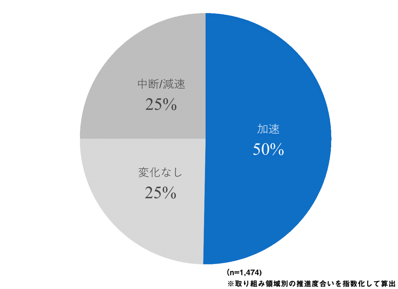 ③新型コロナによるDXの取り組みへの影響については、半数が「加速」と回答。従前から推進していたDXの必要性が一気に増し、加速した様子が伺える