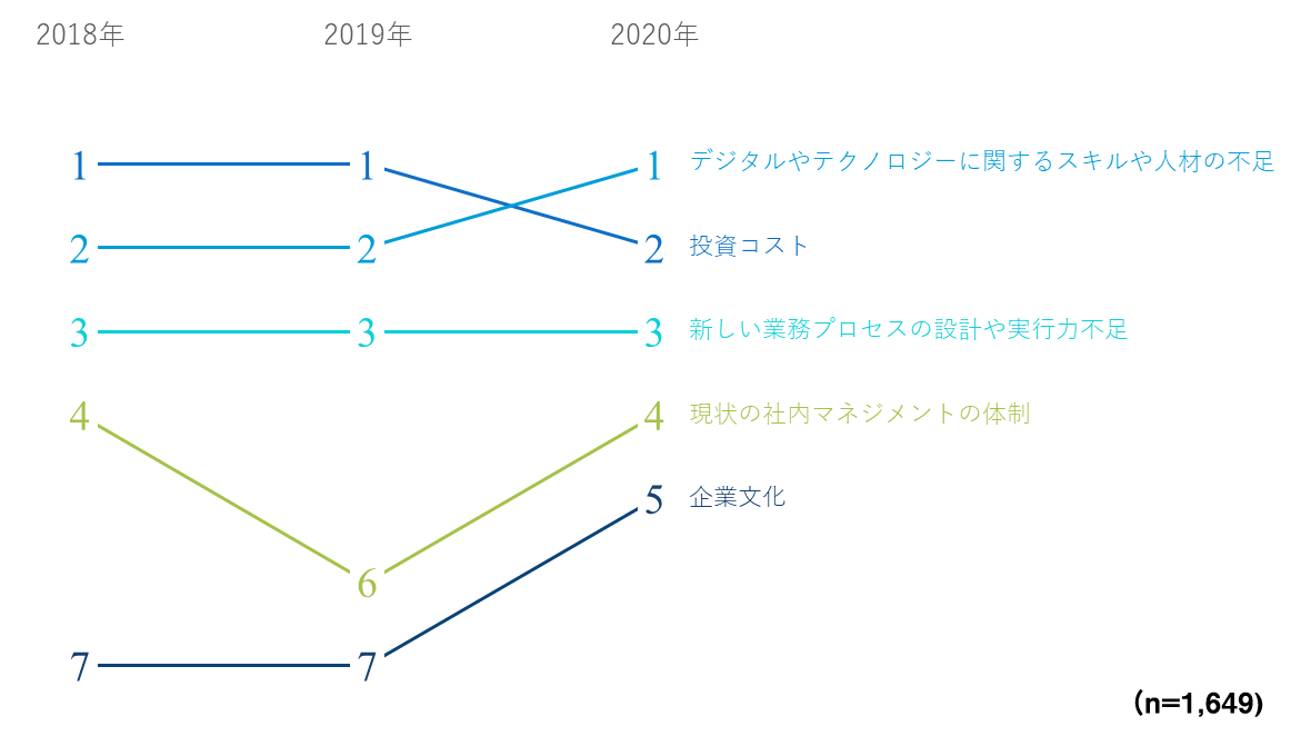 ⑦DXの推進上の障壁は、2018、2019年ともに「コスト」がTOPだったが、今年は「スキルや人材不足」がTOPとなった