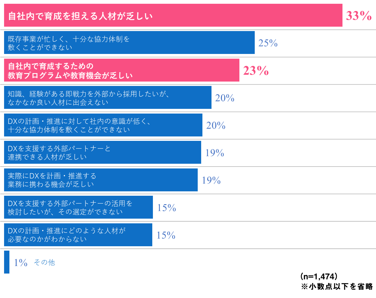 ⑧DXの推進上の障害である「スキルや人材不足」について、具体的には「自社内で育成を担える人材が乏しい」「自社で育成するための教育プログラムや教育機会が乏しい」が上位となり、自社内での育成に関する課題意識が高い