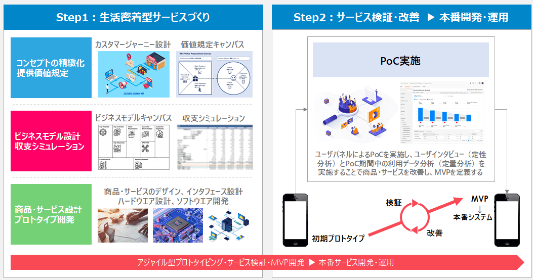 同組織では、新規事業開発にあたり、まず、企業の経営課題・事業目標を基点に生活者へのインタビューやカスタマージャーニー分析を通して生活者の日常におけるペインポイントとその際の感情を洗い出し、解決するための最適な顧客体験設計、事業としてのサービスデザインを行います。さらには、実用化に向けてアジャイル型でプロトタイプを開発し、実証実験(PoC)で生活者の意見を取り入れてブラッシュアップした上でMVP(Minimum Viable Product:実用最小限の製品)のプロダクト構築を行うことで高い顧客体験価値を創出し、本番サービス開発、運用まで一気通貫で行います。