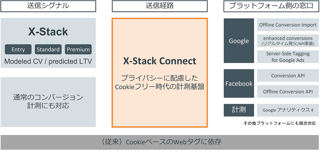 こうした背景から、Cookieに依存しない"Cookieフリー時代"に向け、ユーザーのプライバシーを保護しながら、正しいユーザーのウェブサイト上の行動計測とそれに基づくマーケティング施策の最適化維持を両立する新しい計測基盤「X-Stack Connect」を開発しました。