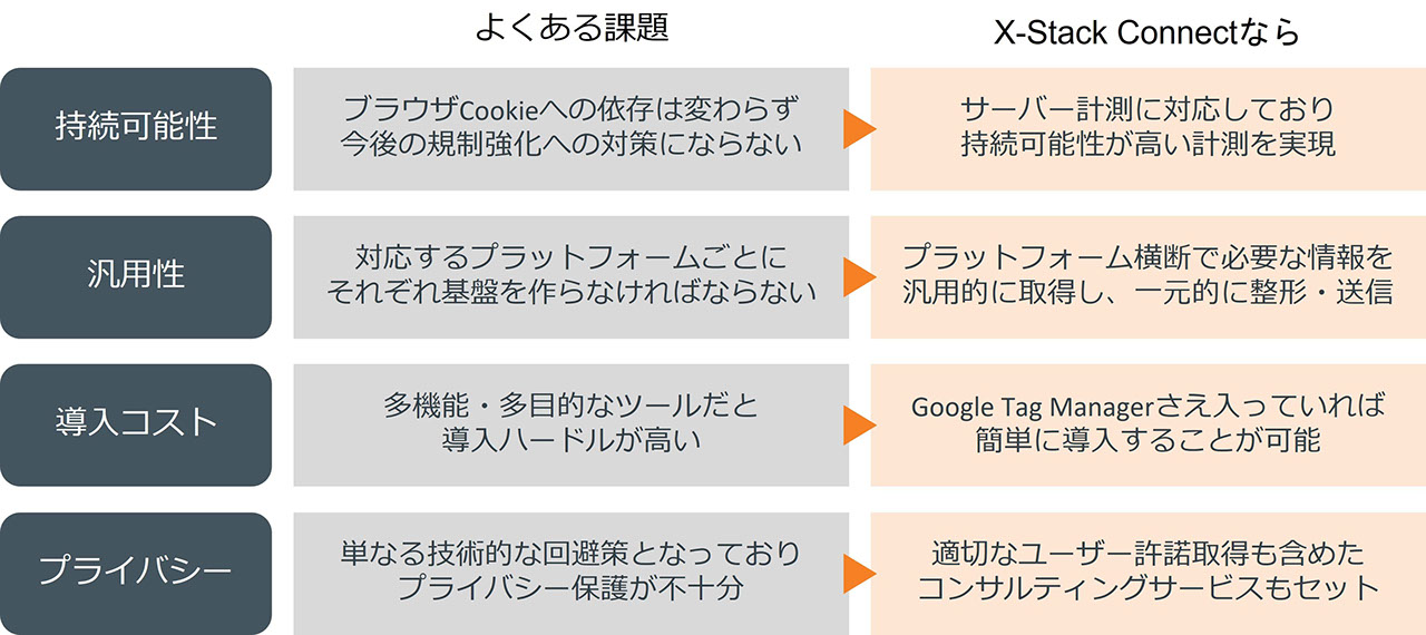 プライバシー保護と計測環境の維持を高いレベルで両立させるため、「X-Stack Connect」は下記4点の課題をクリアする形で開発されています。