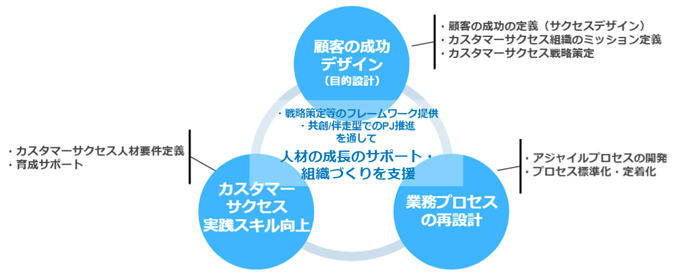 本サービスは、知識インプットや資格取得に偏重しがちなeラーニング等による人材育成ではなく、実際にプロジェクトを伴走・共創型で推進する中で活きたマーケティング人材育成や組織構築を行います。具体的には、①組織の目的設計(カスタマーサクセス戦略/ミッション定義等)、②カスタマーサクセス実践スキル向上(顧客シナリオ設計/人材育成サポート等)、③業務プロセスの再設計(アジャイルプロセスの標準化、定着化)の順で支援します。