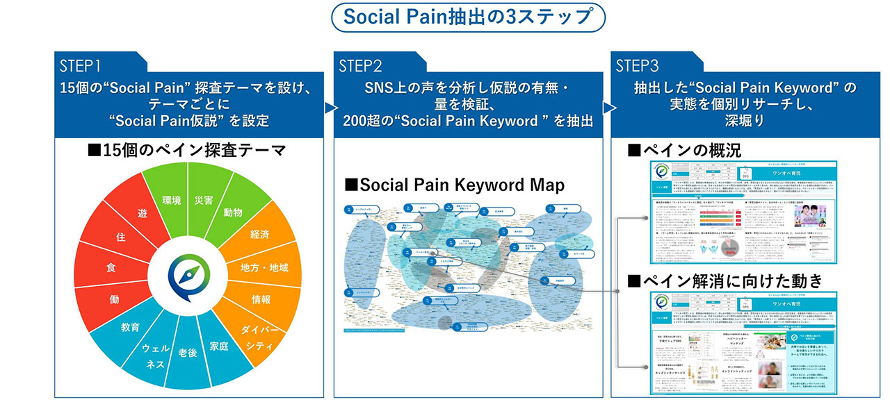 Step1:15個のSocial Pain探査テーマ※を設け、テーマごとに"社会的に不満とされている事象"を一次研究し、"Social Pain仮説" を抽出